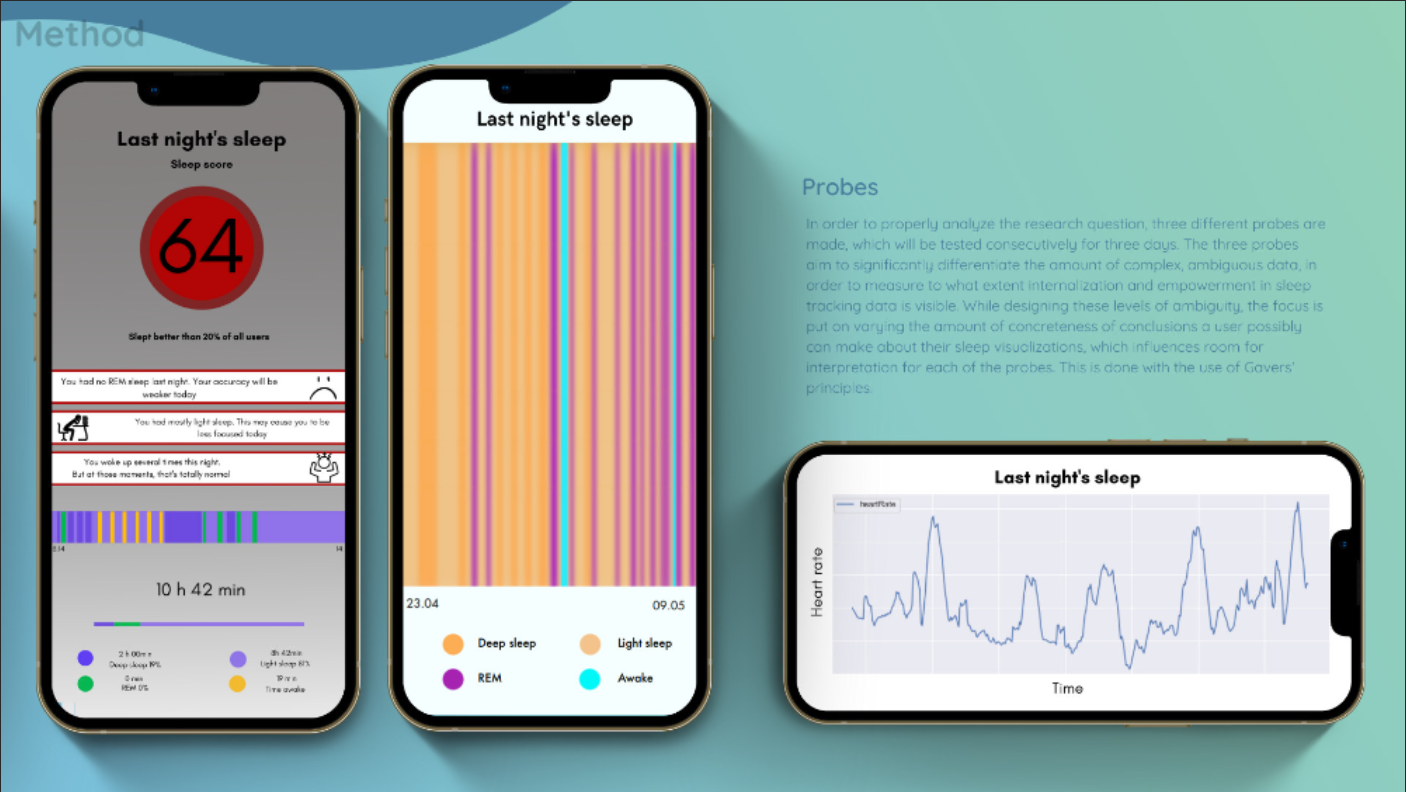 The results in this article are based on questionnaires in combination with an in-depth interview. We report on changes in perceived sleep quality after seeing the representations, perceived empowerment of the three visualizations, understanding and interpreting the visualization, freedom to make your own conclusions and preferences.